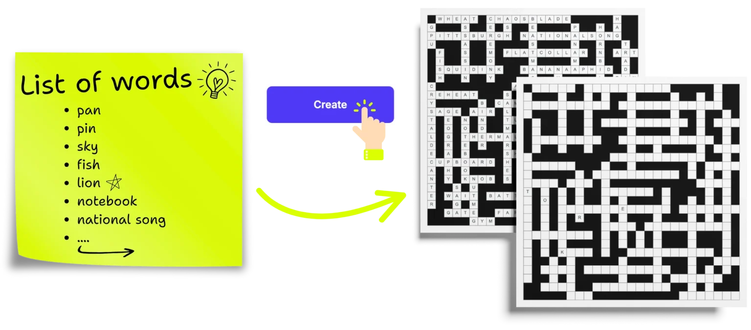 Just one word list. One click. And boom, you’ve got a complete Word Fill-in puzzle page. No design skills. No templates. No stress.