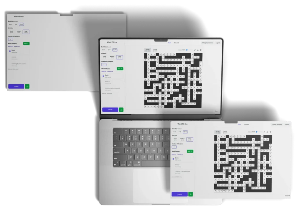 You don’t have to wrestle with grids or manually place every single word. The tool handles everything for you, from generating clean layouts to creating solution keys to producing polished, print-ready pages. All downloadable images are provided in crisp 2K resolution.