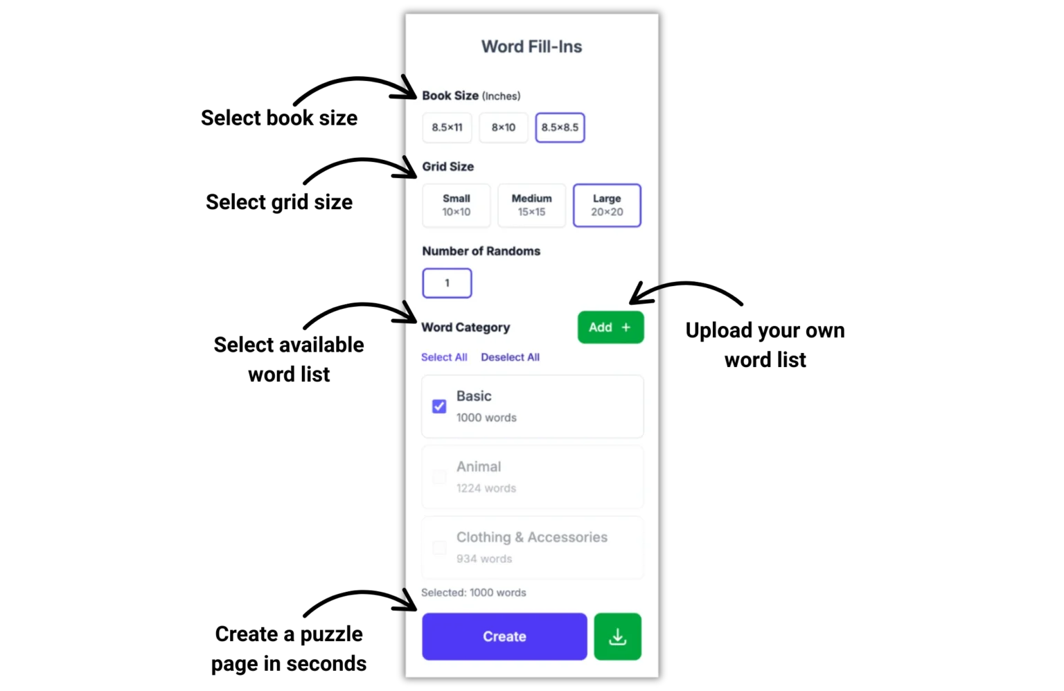 A ready-made collection of 1,000 handpicked words across diverse topics, helping your customer kickstart puzzle creation immediately without delay.